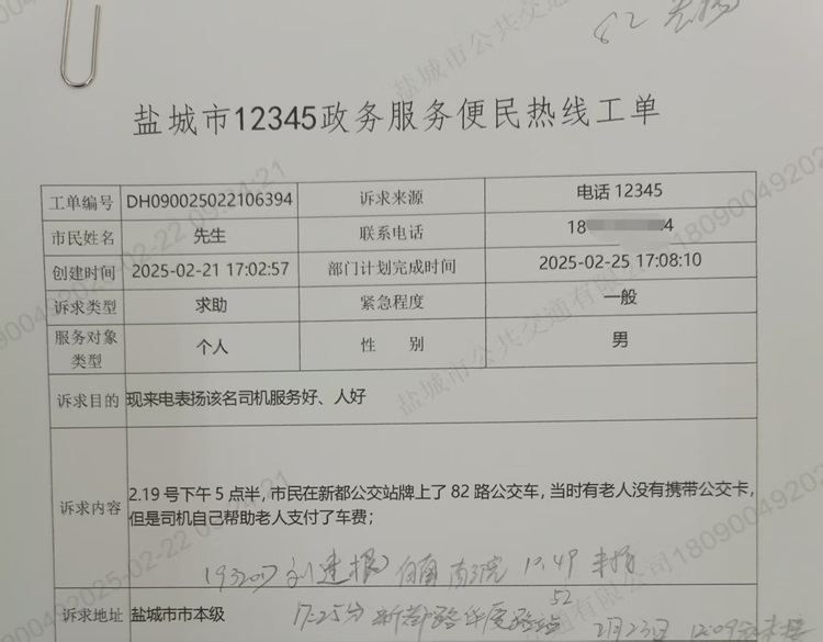 2月21日,二分公司收到12345政务服务便民热线发来的表扬工单,称赞82路驾驶员刘建根服务好,暖人心。