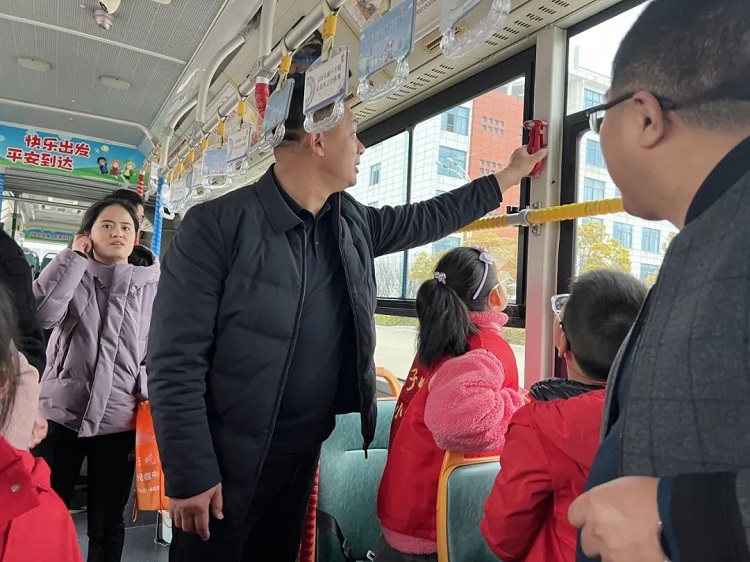 在公交车内,工作人员带领小记者们参观了公交车内部构造,讲解了驾驶员的工作日常以及车内灭火器、安全锤等消防设施的使用方法,让他们明白了公交驾驶员不仅要有熟练的驾驶技术,还要具备良好的服务意识和责任心,为乘客提供安全、舒适的乘车环境。通过现场演示和互动体验,小记者们不仅学到了实用的安全知识,提高了应急处置意识,更懂得了"安全无小事"的道理。