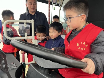 为了增加研学活动的趣味性,公司还为小记者们准备了驾驶体验、车内寻宝和滚轮胎游戏。小记者们化身"小小驾驶员",坐进驾驶室感受公交司机的日常工作视角。