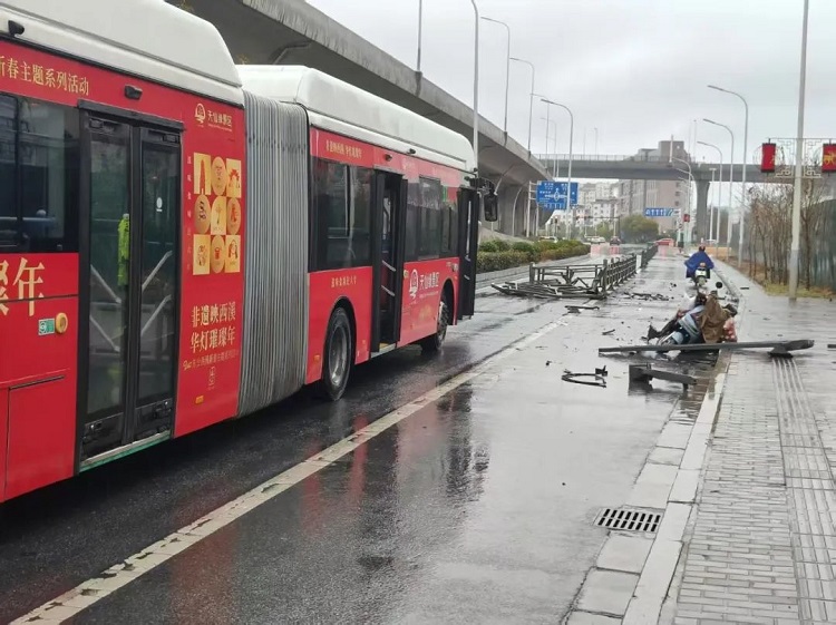 事情发生在3月3日下午15:35分左右,孙海雷驾驶B1线公交车从潮声路停车场发车,行驶至黄海路范公路北侧时,突然听到“嘭”的一声巨响。他循声望去,发现一辆小型SUV汽车撞倒了路边的护栏,护栏直接砸向了一辆正常行驶的电动车,电动车驾驶员当场受伤倒地。