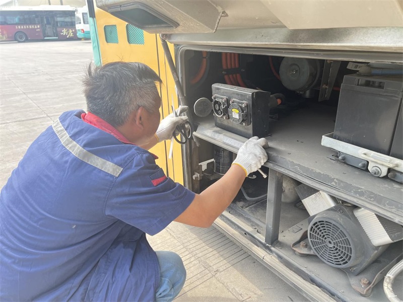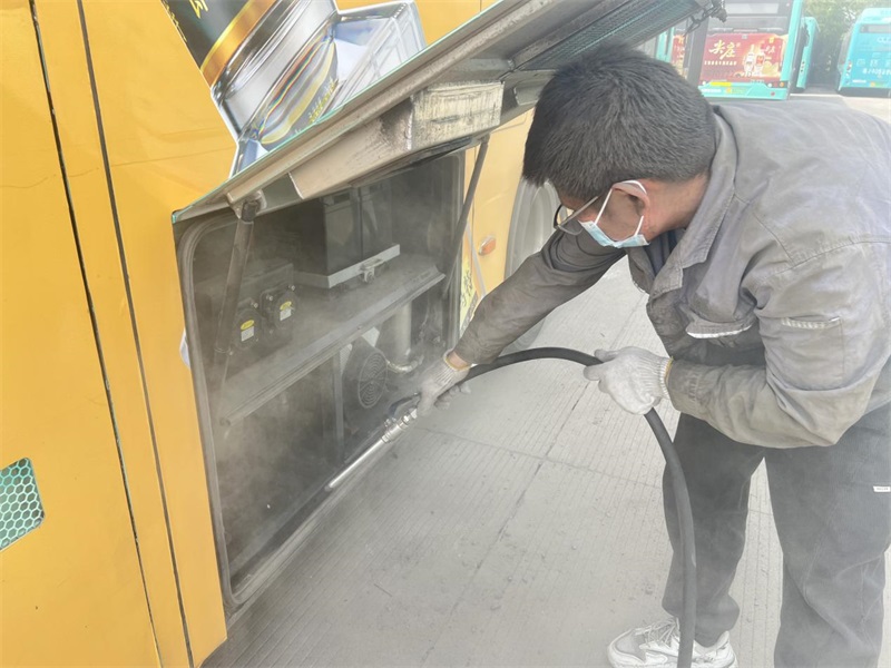 检查中,重点对散热器、风扇、冷凝器、高压电池舱散热系统进行全面清理,清除积灰与柳絮,检查工作状态,确保散热效率,降低高温引发的安全隐患;检修线路磨损、油液渗漏等,加固老化线束防护措施,杜绝“跑冒滴漏”现象;对车载空调进行全面检修,确保在夏季来临前全部制冷有效;继续常态化检查转向机构与制动系统等部件,确保安全行车。