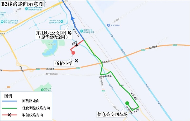 为进一步优化公交线网布局,降低线路重复系数,提升整体运营效能,更好方便市民出行,盐城公交于6月21日优化B2线、12路。具体如下: