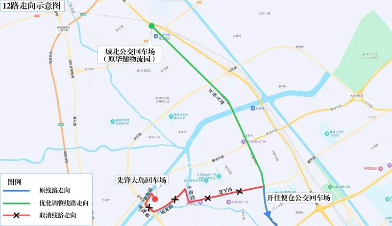 调整后走向:城北公交回车场(原华健物流园)、开放大道、盐丰快速通道、开放大道、大仓路、花园北路、便仓公交回车场。