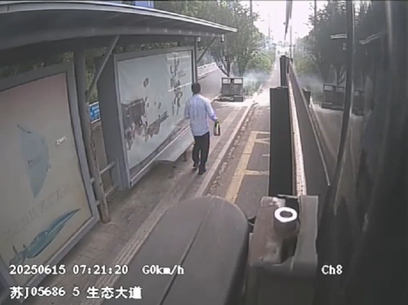 站台垃圾桶起火,公交驾驶员秒变“消防员”