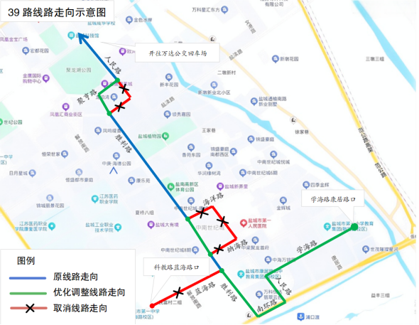 调整后走向:科教路蓝海路口、蓝海路、胜利路、纳海路、人民路、海洋路、胜利路、盐渎路、文港路、东进路、运河路、五星路、文港路、建军路、天山路、太湖路、青墩连接线、建军路、瑞鹤路、政星路、四所、政星路、云溪路、振北路、绿巢路、建军路、S349、盐新路、鹤翔路、市七院。