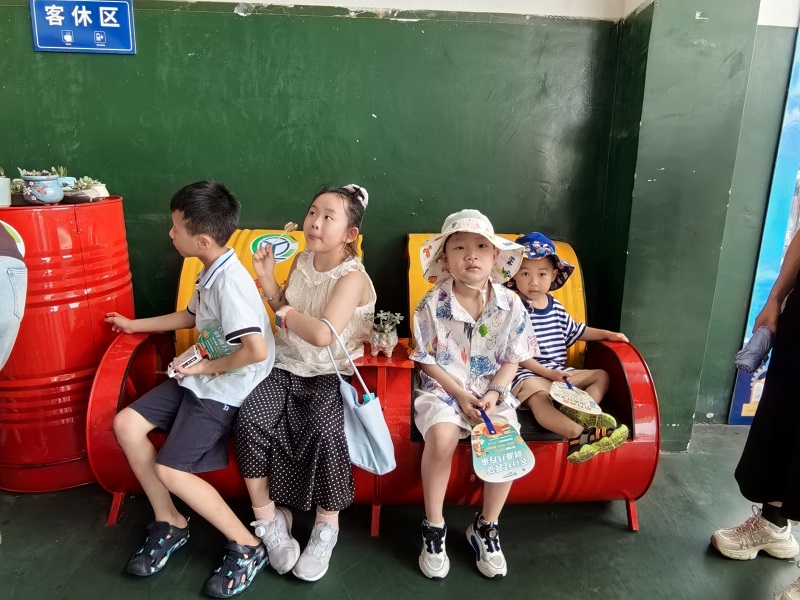 在维修车间里,一排由废旧油桶与轮胎改造而来的环保座椅,吸引着孩子们纷纷上前试坐体验。一辆新能源公交车正在接受“体检”,得知它“只吃电不喝油”时,孩子们纷纷称赞:“公交车真是环保卫士!”