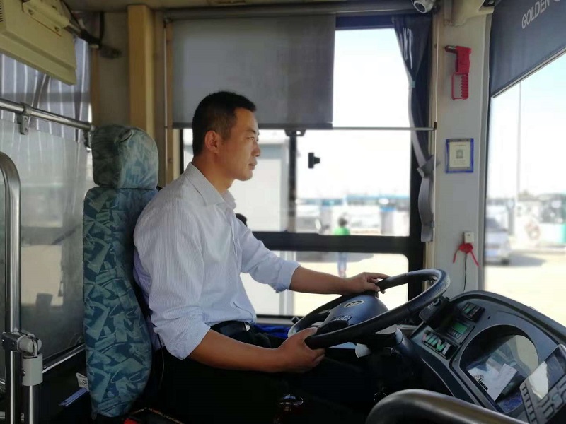 唐海军坐上公交车驾驶室准备出发